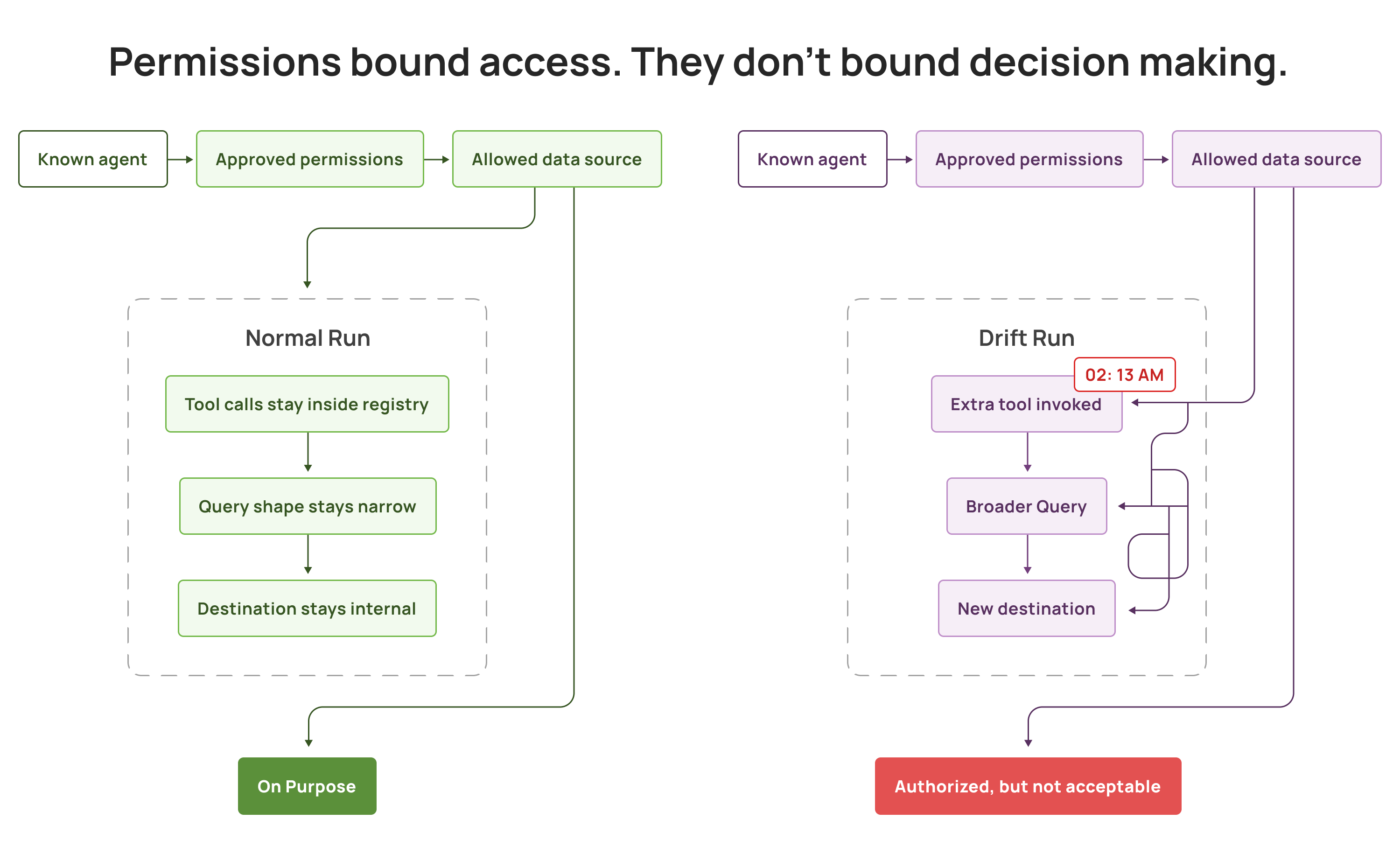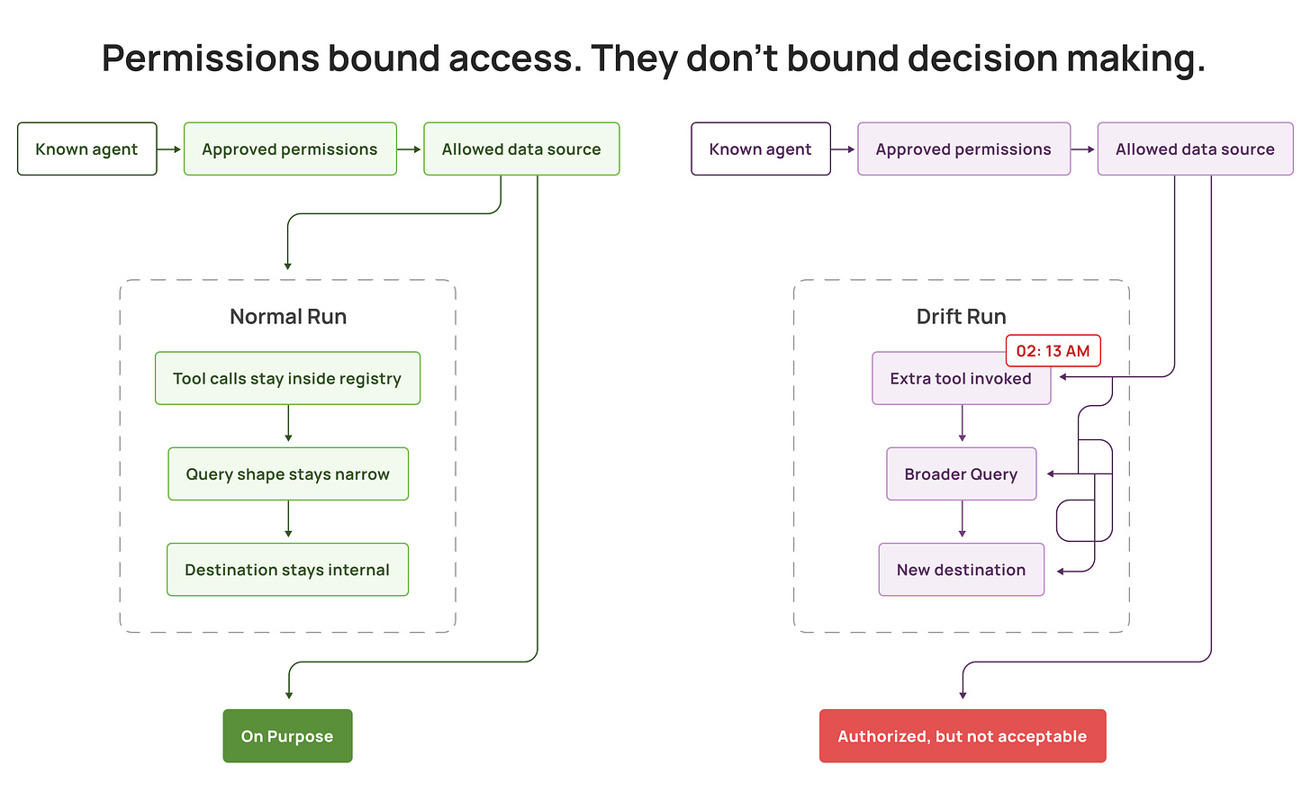 Not because the agent broke out of permissions, but because agents are non deterministic. They choose their next step based on context. The same request can lead to different tool calls, different query shapes, different data breadth, and different destinations each time. Because the policy is static, but the agent’s plan is dynamic.