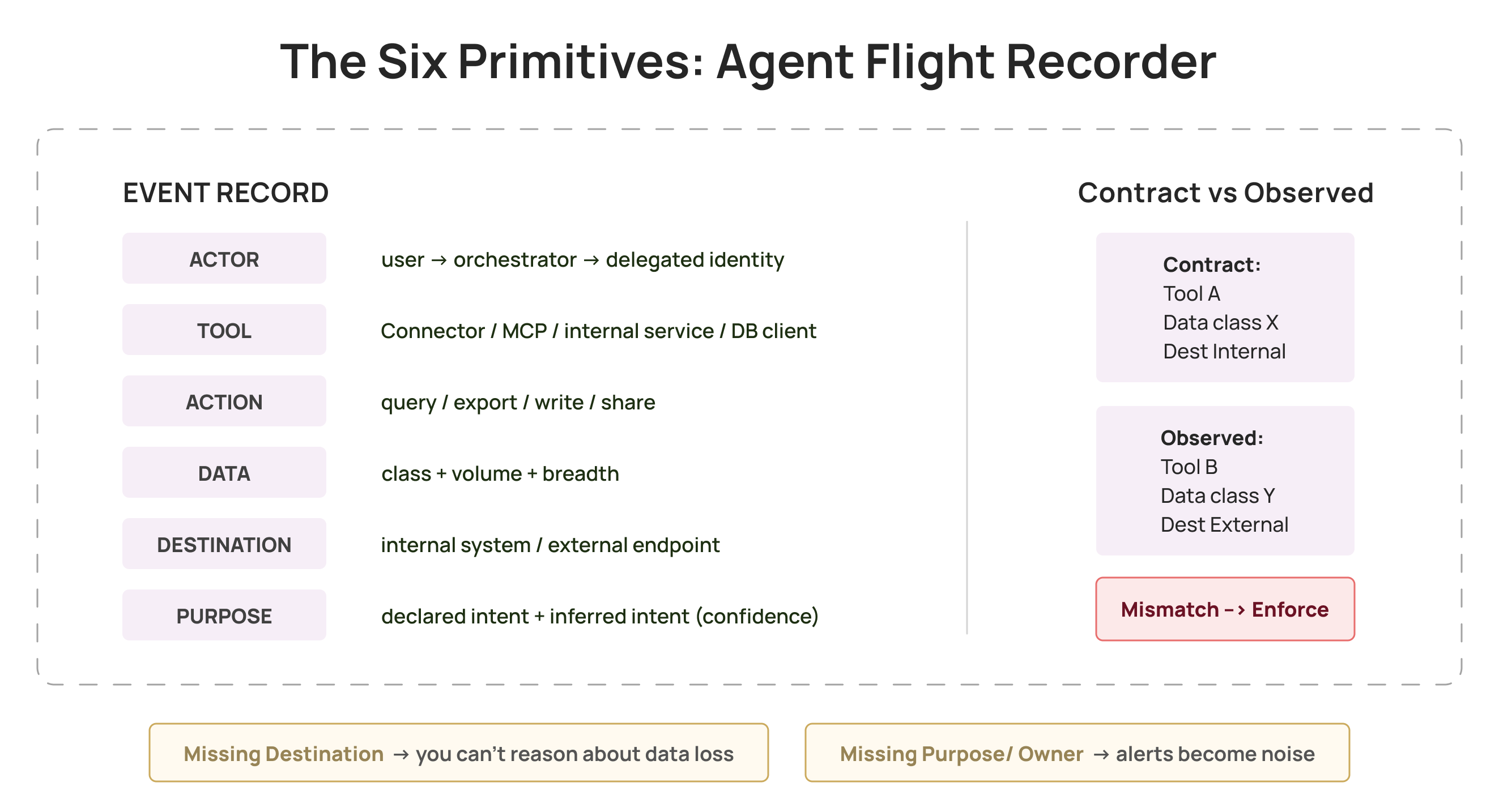 For the loop to work, governance and runtime evidence need a shared vocabulary. These six primitives cover almost every agent incident worth caring about: