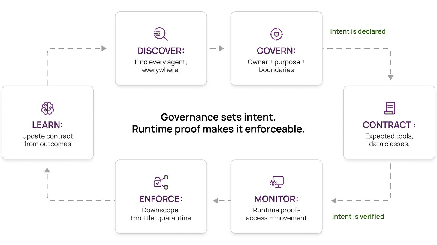 Discovery gets you inventory. Governance sets intent. Runtime evidence contains drift. The teams that do this well close the loop: define the contract, collect proof, contain drift, and learn fast.