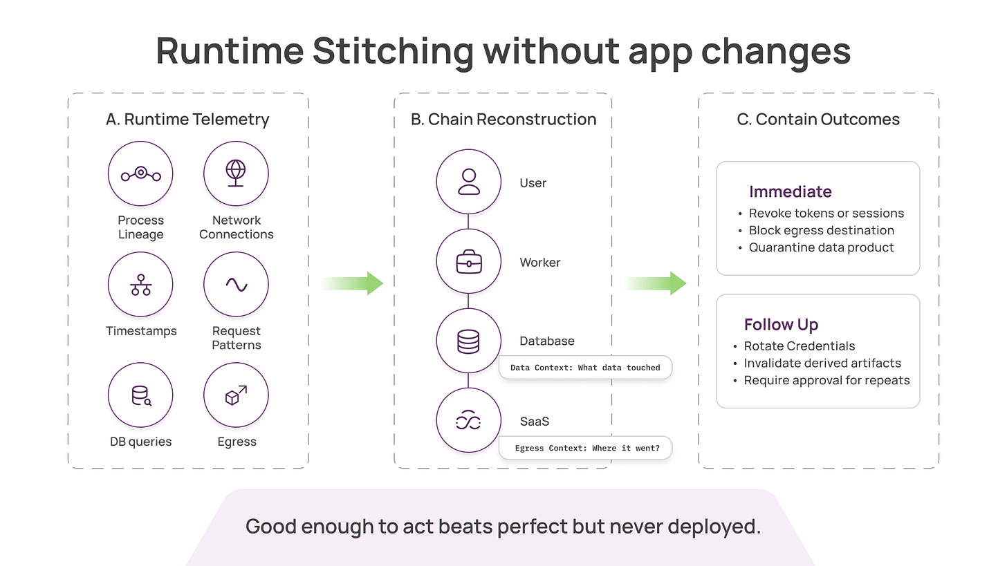 Agents often need broad permissions to be useful. Their actions are not fully predictable. The security requirement shifts from “was this allowed?” to “what did the chain do, who initiated it, and how quickly can we contain outcomes?”