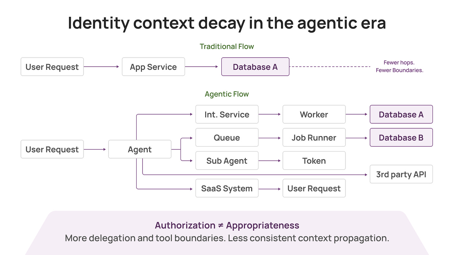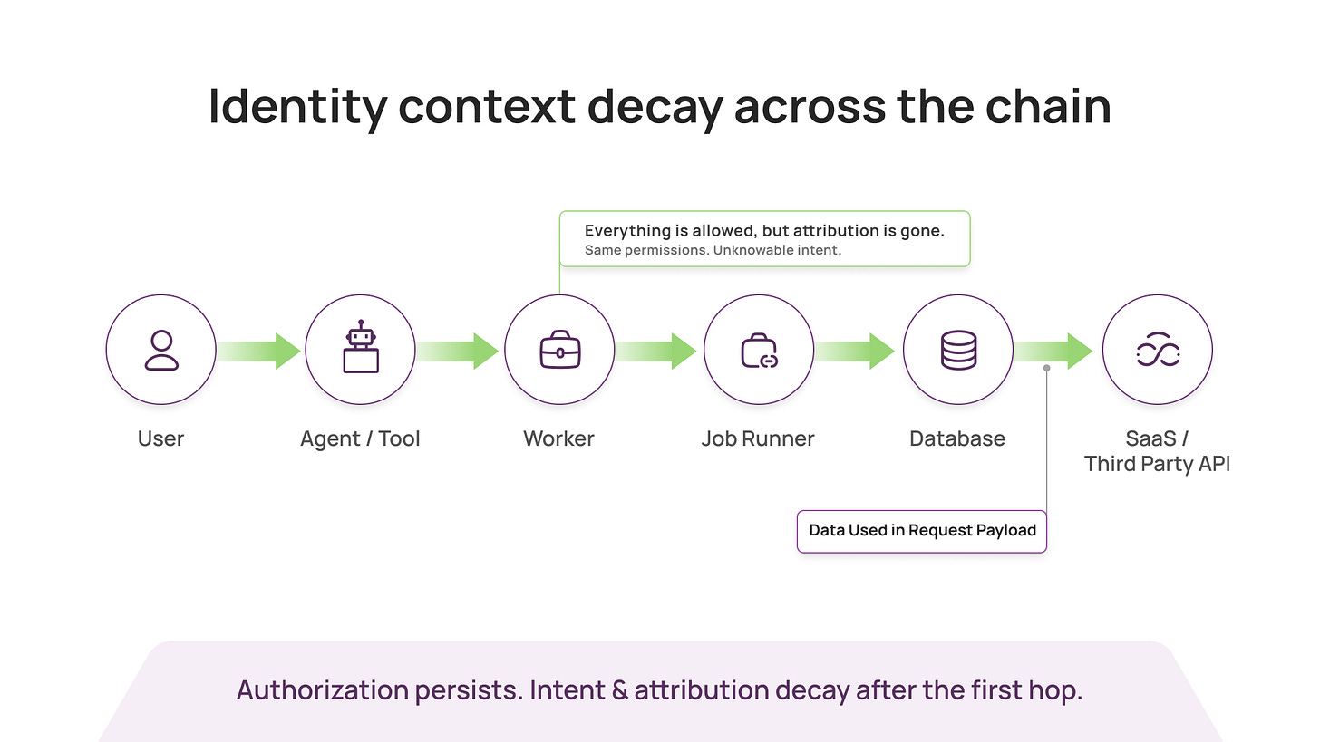 In real systems, identity context decays after the first hop.