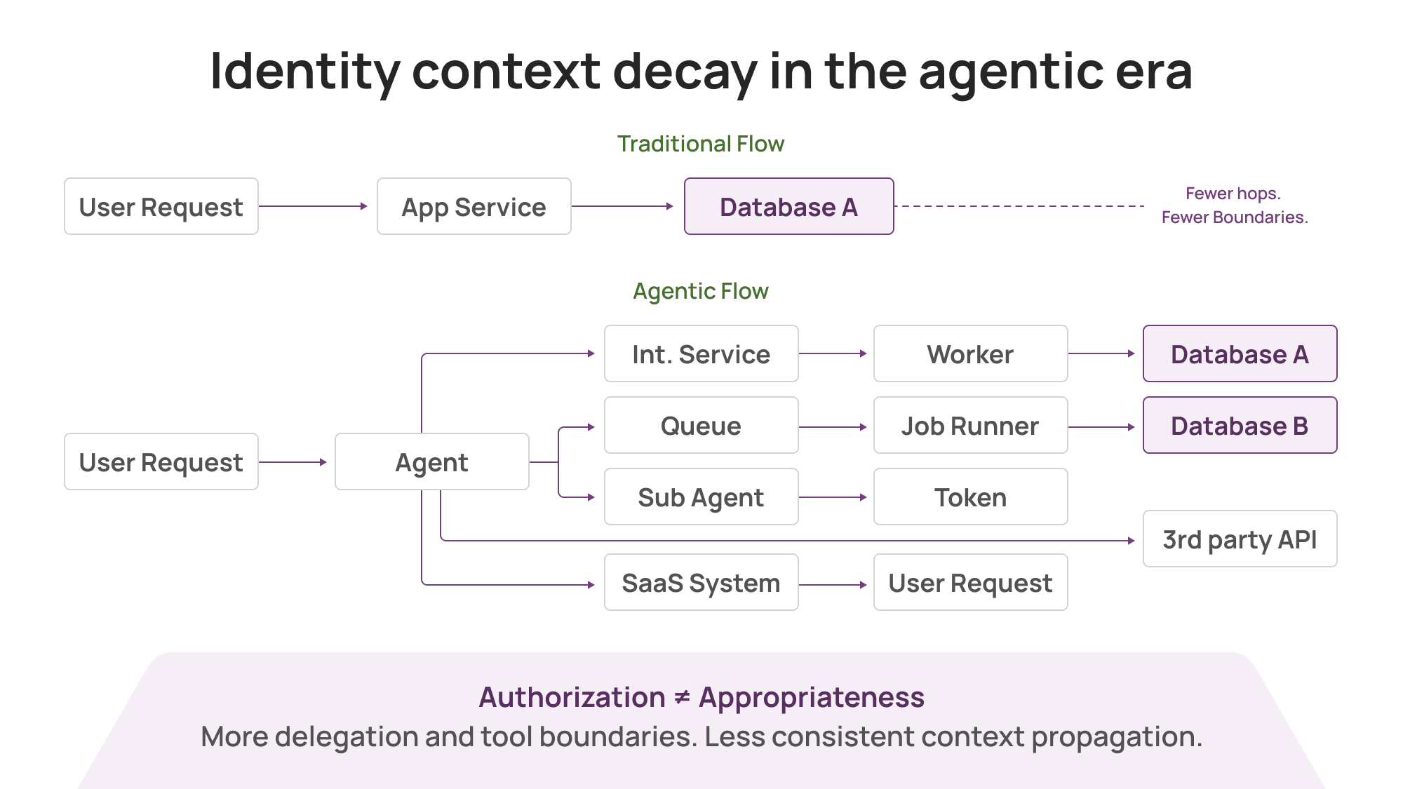 A user action triggers a web service. That service calls a worker. The worker calls a job runner. The job runner queries a database and hits a third-party API. Somewhere along the way, the original “who” gets replaced by a “what”: a token, a role session, a workload identity, an access key, a service account.
